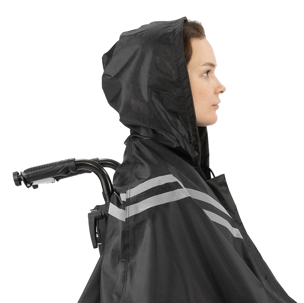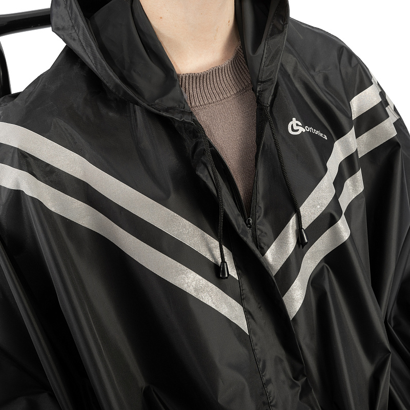 Дождевик-пончо для инвалидной коляски предназначен для езды в плохую погоду и защищает от дождя, ветра и других неблагоприятных погодных условий. Свободный крой дождевика-пончо обеспечивает легкость надевания и снятия, что делает его удобным для малоподвижных пользователей. Удлиненная передняя часть дождевика-пончо защищает ноги от влаги. Чтобы повысить безопасность в условиях плохой видимости, дождевик-пончо оснащен светоотражающими полосами.